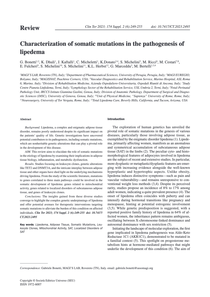 L’étude menée par G. Bonetti et ses collaborateurs se distingue en se concentrant sur la caractérisation des mutations somatiques dans le lipoedème. Contrairement aux mutations germinales, présentes dès la naissance et héritées des parents, les mutations somatiques se produisent au cours de la vie d’un individu et affectent seulement certaines cellules spécifiques.